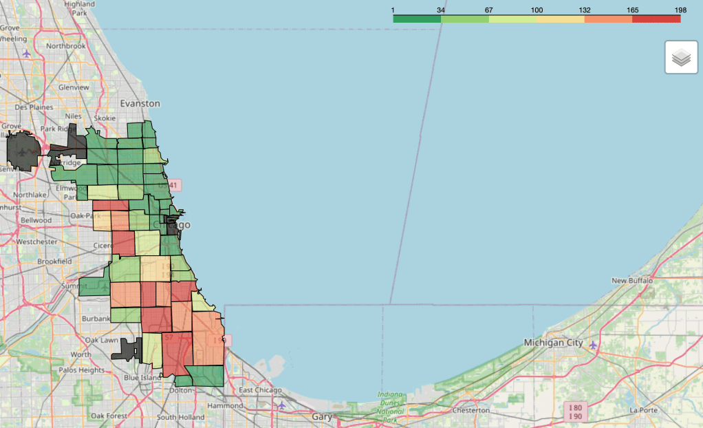 - We employ Folium, a library built on Leaflet.js, to explore whether certain zip codes in Chicago experience higher rates of gunshot violence.