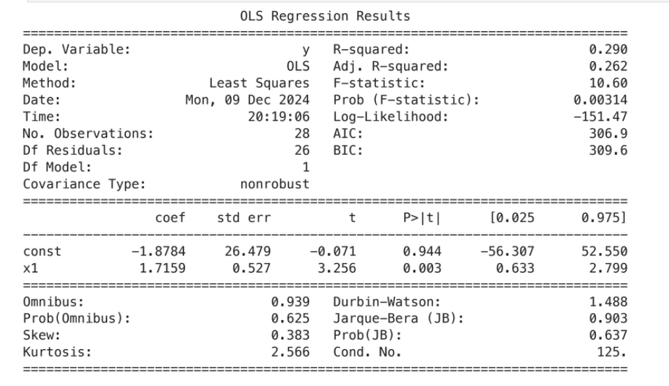 - We note a fairly low R Squared statistic but a significant model test statistic of 10.60.