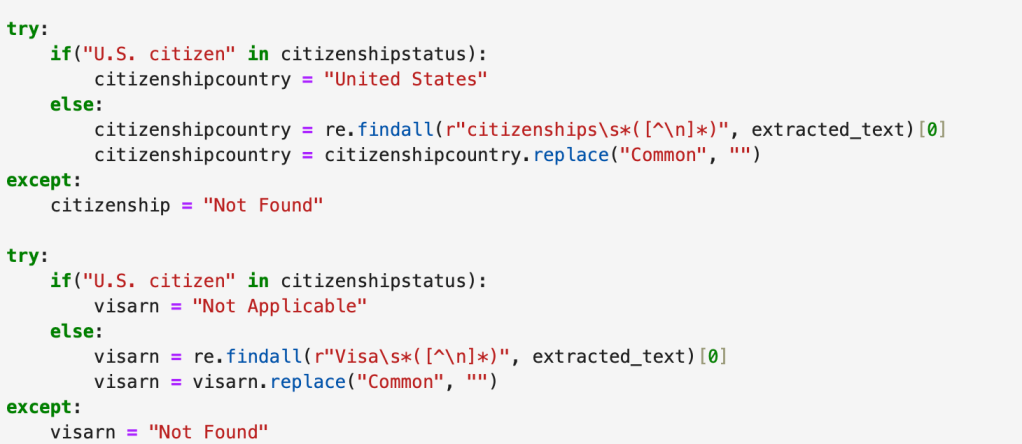 - We employ Regex to generate specific patterns to extract key words to be later inputted into a data frame.